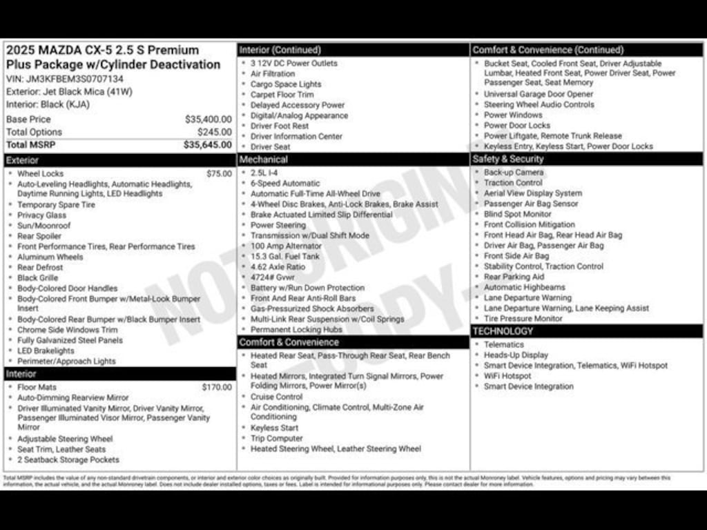 Jet Black 2025 Mazda cx-5 2.5 S Premium Plus Package AWD 6-Speed Automatic SKYACTIV® 2.5L 4-Cylinder DOHC 16V