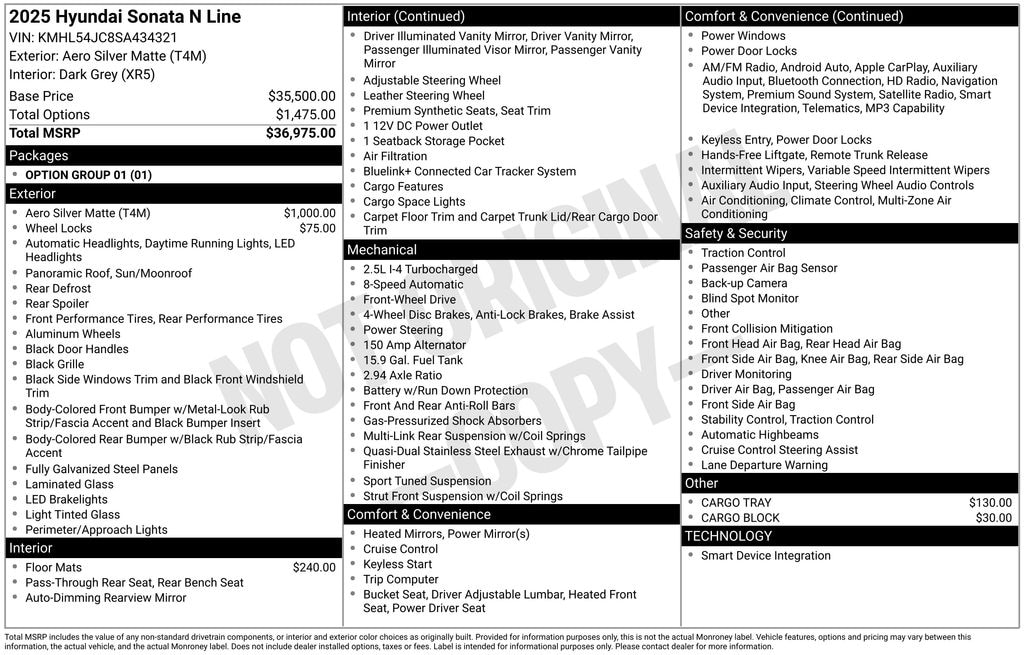Certified. 2025 Hyundai Sonata Aero Silver Matte N Line CPO FWD 8-Speed I4 NO HIDDEN FEES ! THE PRICE YOU SEE IS WHAT YOU PAY PLUS TTLD, FRESH HYUNDAI USED CAR, ACCIDENT FREE, LOCAL TRADE, SERVICED AT WILKINS, ALL SERVICE RECORDS AVALIABLE, CERTIFIED PRE-OWNED, AMERICAS BEST WARRANTY, LOW MILES, NON-SMOKER VEHICLE, EXTRA CLEAN, ONE OWNER, BACKUP CAMERA, KEYLESS ENTRY, HEATED SEATS, LEATHER INTERIOR, POWER DRIVERS SEAT, PANORAMIC ROOF, ADAPTIVE CRUISE CONTROL, GPS NAVIGATION, APPLE CAR PLAY, REMOTE START, SIRIUS XM SATELLITE RADIO, BRAKE ASSIST, LANE KEEP ASSIST, BLUE LINK, HIGH BEAM ASSIST, REAR PARKING SENSORS, BLIND SPOT WARNING, BLIND SPOT DETECTION with REAR CROSS-traffic Alert and Lane Change Alert, SURROUND VIEW MONITOR, FORWARD COLLISION -ALERT, Black Artificial Leather, Navigation System.